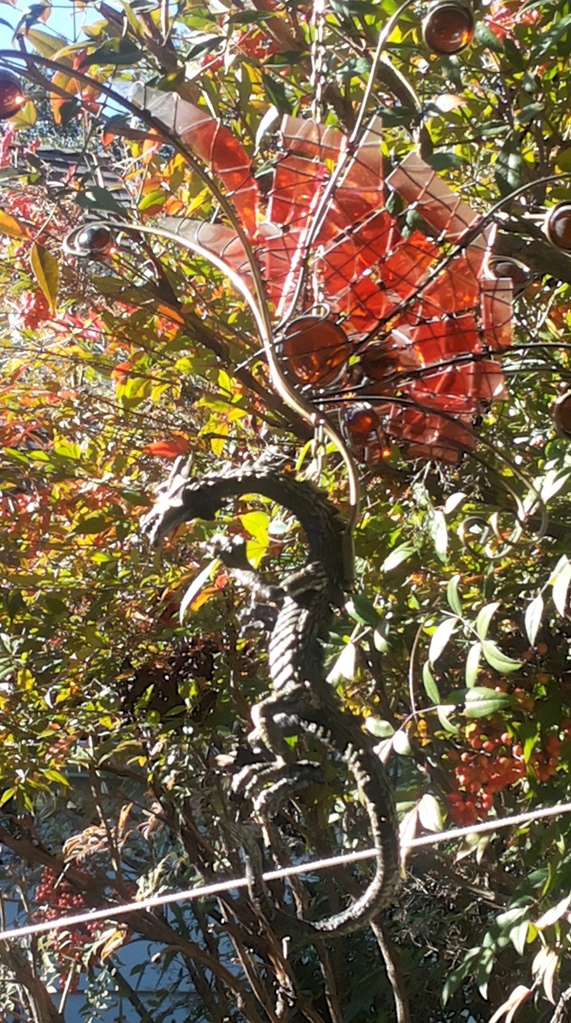 A gift to Dr Julie Henderson whilst staying at her home and the home of Zapchen Somatics, Napa, California USA 2015. He hangs outside in the courtyard entrance along with other dragons and luminous beings.