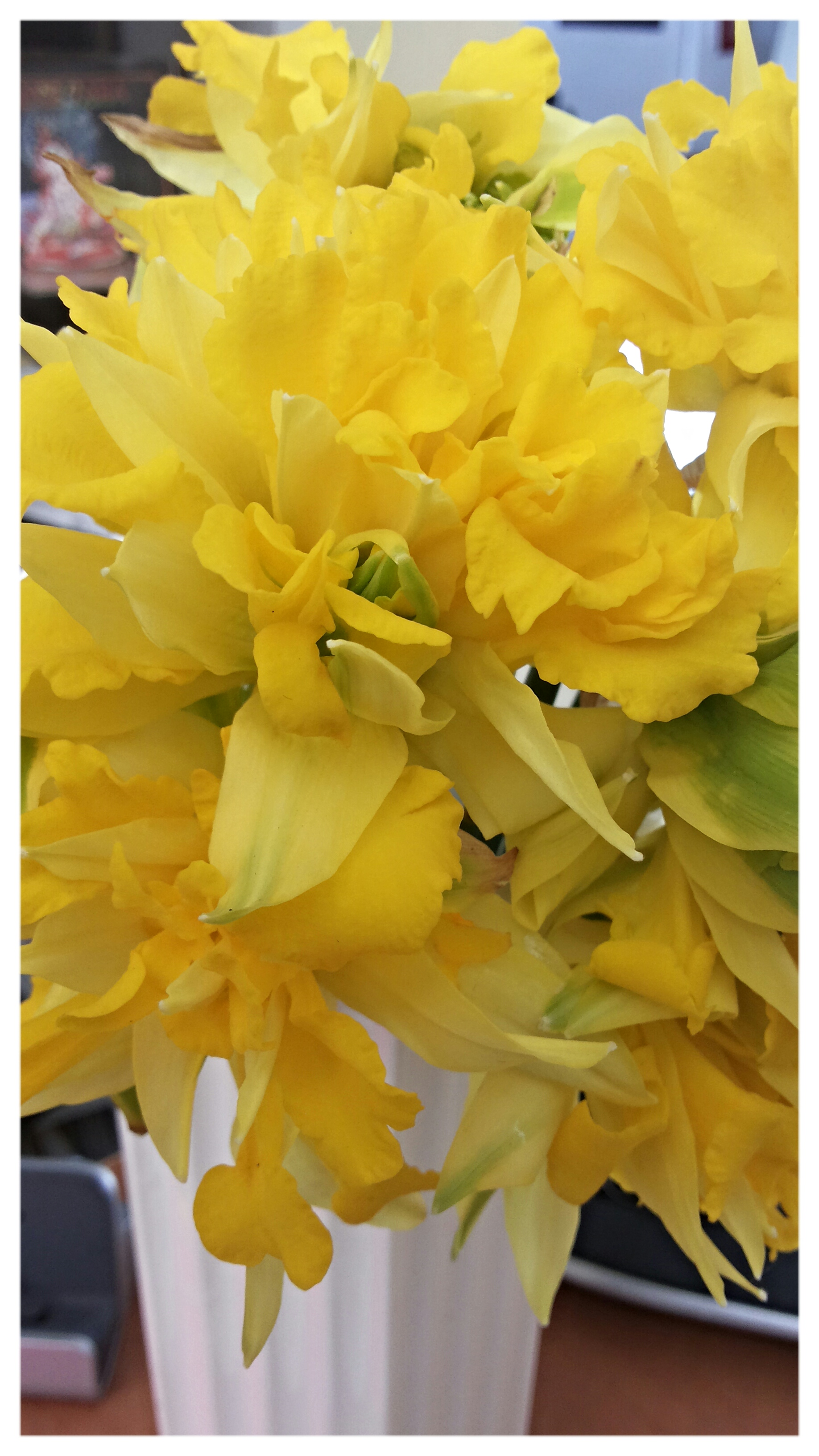 Wild jonquils in Spring from a neighbours garden. And, the vase from neighbourhood hard rubbish collection on the nature strip.