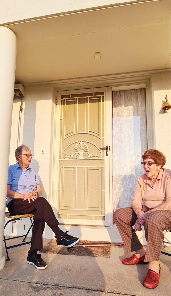 184 years young. Two of my neighbours, Gwen and Jean, in their early 90’s sitting on blue and gold ‘queen’ chairs on the portico of my house the night before leaving country Victoria for Melbourne.