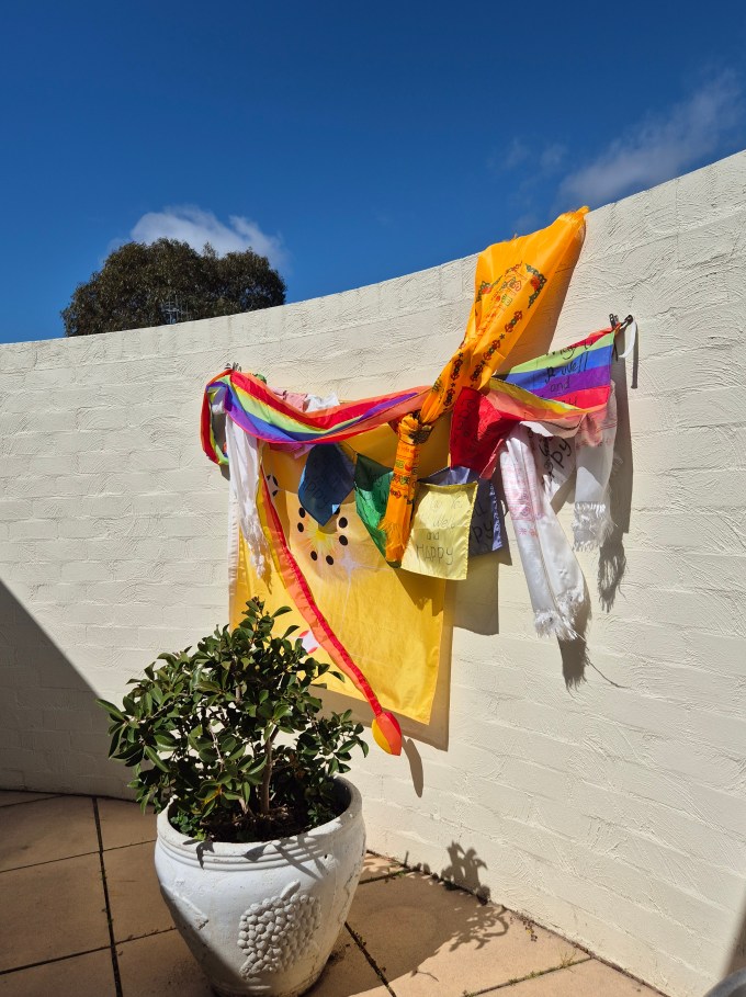 Photo credit; k.bell. Prayer flags from around the world in my courtyard. Gratitude to Bairo Tulku.